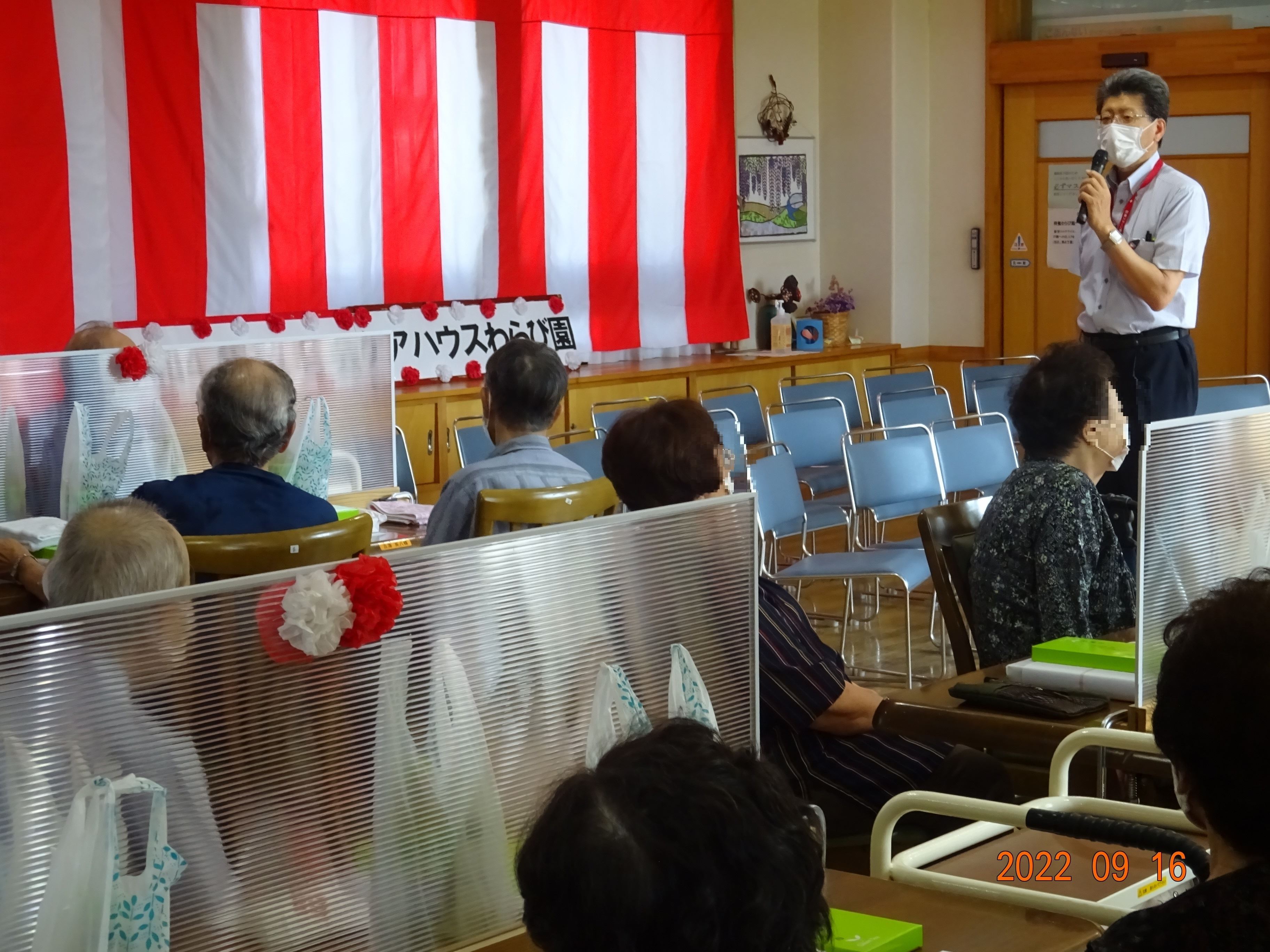 敬老会を行いました。 2022年9月27日 最終更新日時 : 2022年9月27日 user_01 わらび園内におけるコロナ陽性者対応も終息し、 無事 令和4年度敬老会を開催することが出来ました。 初めに、園長よりお祝いの挨拶がありました。 ケアハウスわらび園のこれまでの歩みをスライドで振り返り、 皆さん懐かしんでいました。
